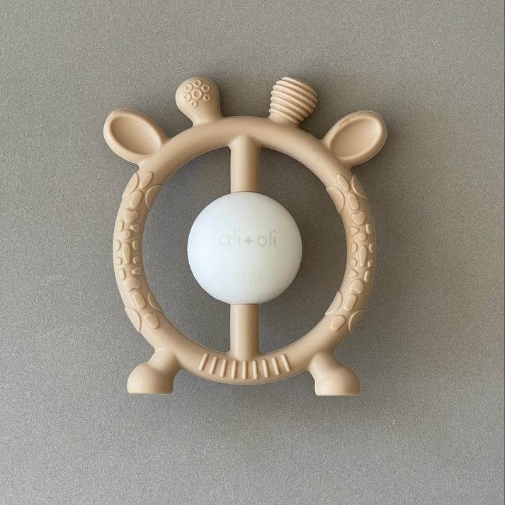Introducing the Giraffe Teether and Rattle (Taupe) from Ali + Oli, a delightful and practical toy designed to soothe and entertain your little one. This adorable giraffe teether combines the comfort of a silicone teether with the engaging sound of a gentle rattle, making it the perfect companion for teething babies.