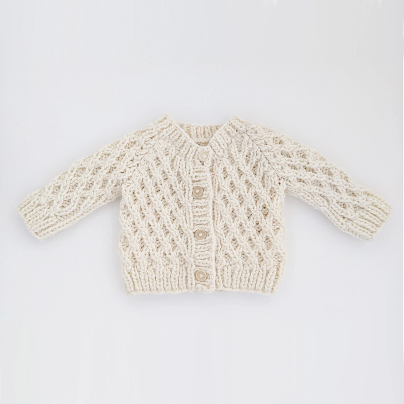 Thick, soft waffle cardigan sweater has raglan sleeves and wood buttons. Hand-knit in a rich natural colored yarn, it is cozy and warm. What a wonderful gift for any little person you know.