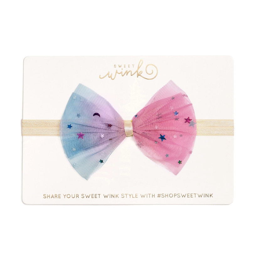 This Sweet Wink headband has a gold glitter elastic band with a multi colored tulle bow accented with metallic stars and moons. The stretch elastic ensures the headband fits comfortably on the child's head. Each headband comes packaged on a card for easy display and serves as a great gift. An adhesive hang tag on back of card makes it easy to merchandise headband with coordinating Sweet Wink tutus.