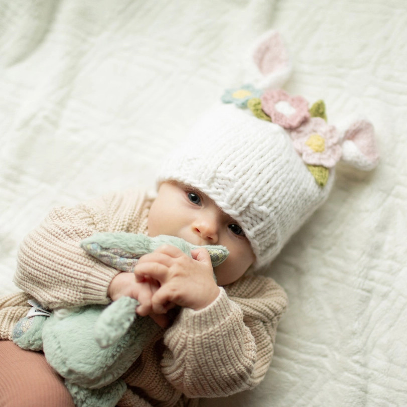 Introducing the adorable Bunny Ears White Beanie Hat by Huggalugs, a perfect addition to your newborn's wardrobe. This charming bunny hat is brand new and crafted with soft, comfortable materials to keep your little one cozy and warm. The delightful bunny ear design adds a touch of whimsy, making this hat ideal for everyday wear or special occasions. It's a wonderful newborn hat for capturing those precious first photos.