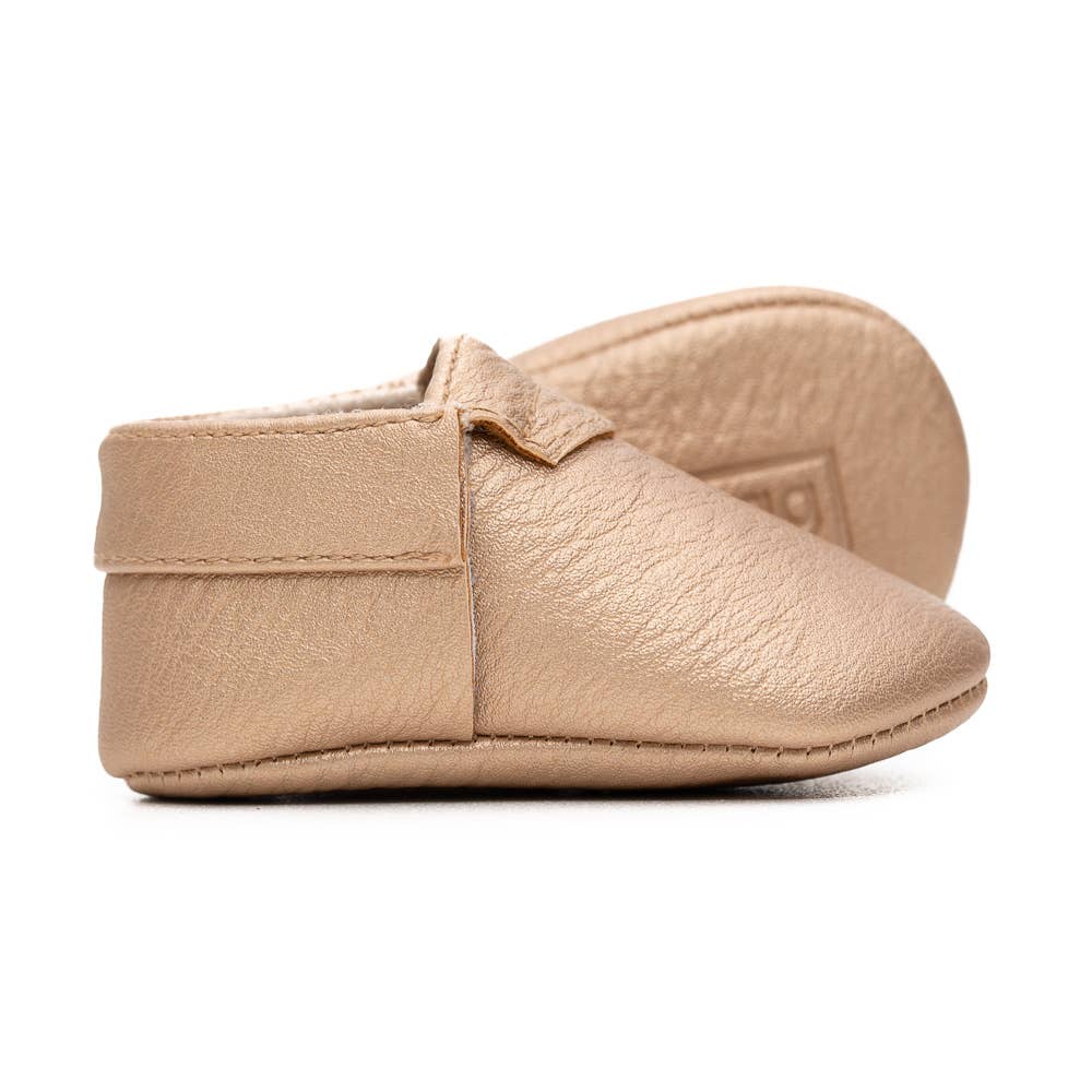 The Modern Mox® is our classic moccasin style. In our 2019 collection, we removed the fringe seen in previous styles to create a new and clean look to our classic moccasin. With an elastic top, the Modern Mox® is easy to slip on and off, while still fitting snug to your child's foot. Each shoe is lined with cotton to keep the foot dry and warm. Sizes 4 and up have hard soles for the new walking babe in your home!