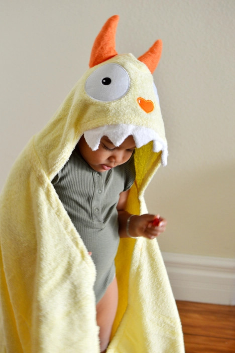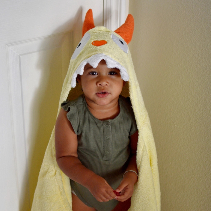 By far, our best seller! We're not sure if it's because kids love the silly face or because parents feel that it's the towel that best captures the spirit of their children. The thirsty, 100% cotton terry towel is in a soft yellow, with orange horns, a sweet orange heart shaped nose, and has white teeth. This monster is great to bring to the bath, beach or pool.