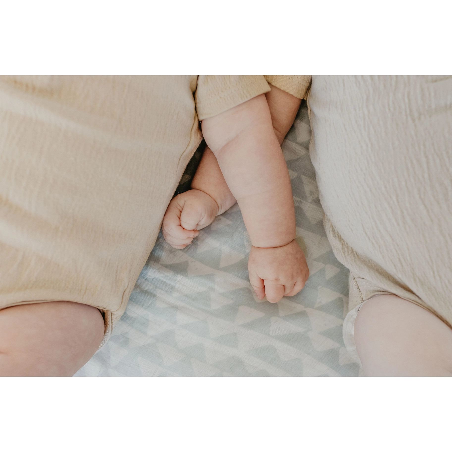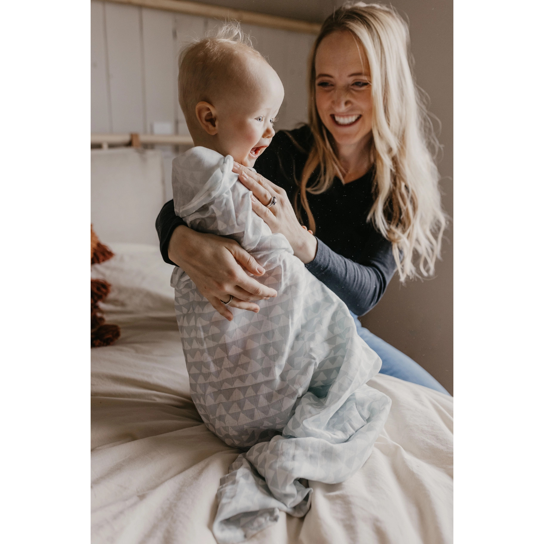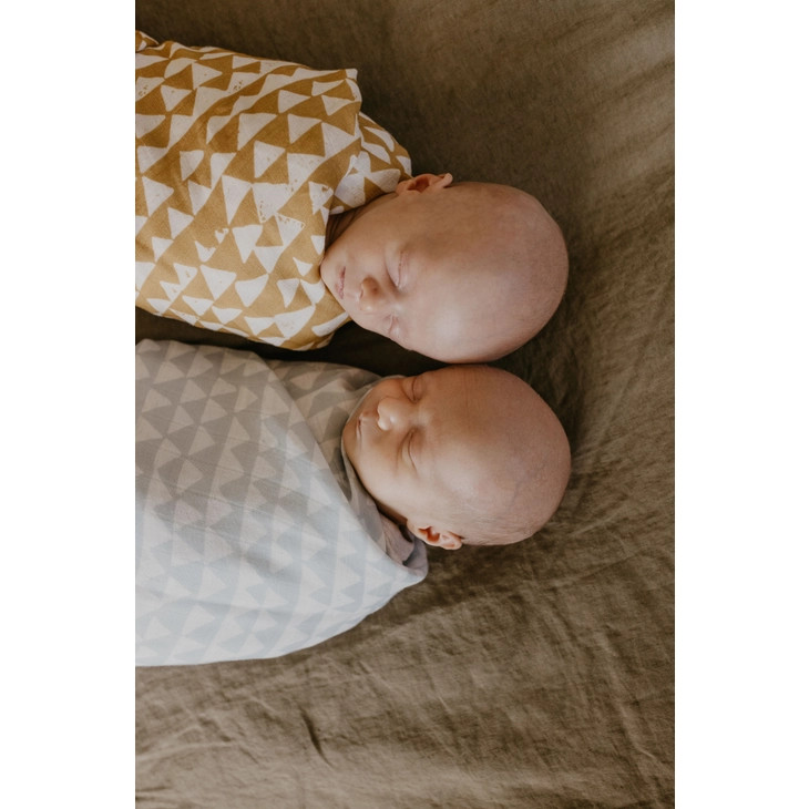 Mountains Swaddle Blanket One day, that little bundle will climb mountains. But for now, enjoy endless cuddles with your baby and our 'Mountains' muslin blanket. Add Mother Nature’s touch to your baby’s everyday. This Mini Wander swaddle design is a part of our collab with Clare Therese, who created unique patterns using carved lino and block printing. The triangular pattern is available on a blue or honey yellow backdrop, reminding us of a snow-covered peak or a sunset hike. THE PERFECT SWADDLE TO KEEP THEM HAPPY. Thanks to its lightweight, loose weave, the Mountain Swaddle blanket stretches when pulled diagonally to make swaddling easy. No more fussing with stiff fabrics, just tuck your baby and watch them drift off to dreamland!