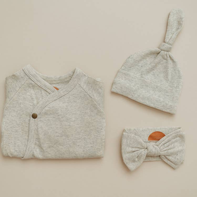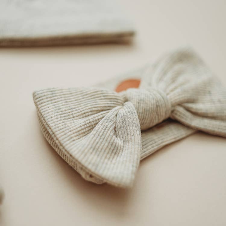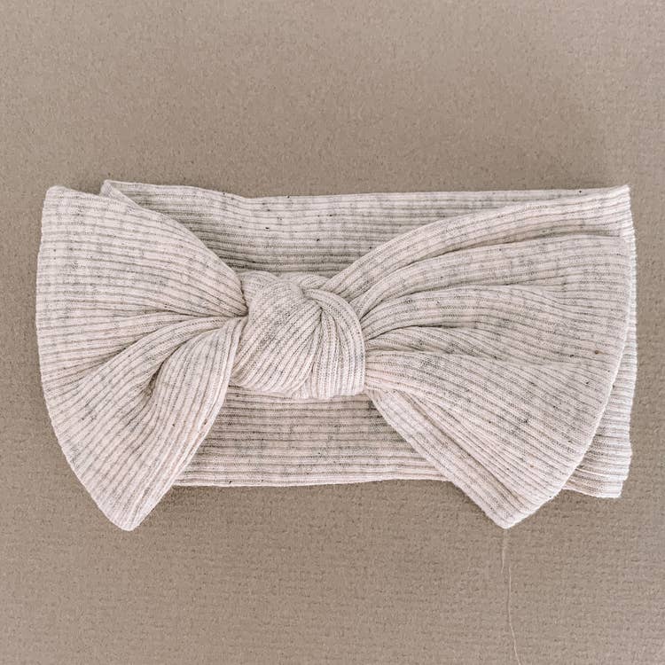 Description Oatmeal Ribbed Head Wrap Newborn Head Wrap. Our ribbed head wraps are made from the same fabric as our ribbed knotted gowns (sold separately). Gentle wash cold Lay flat to dry Made in United States of America Size Newborn