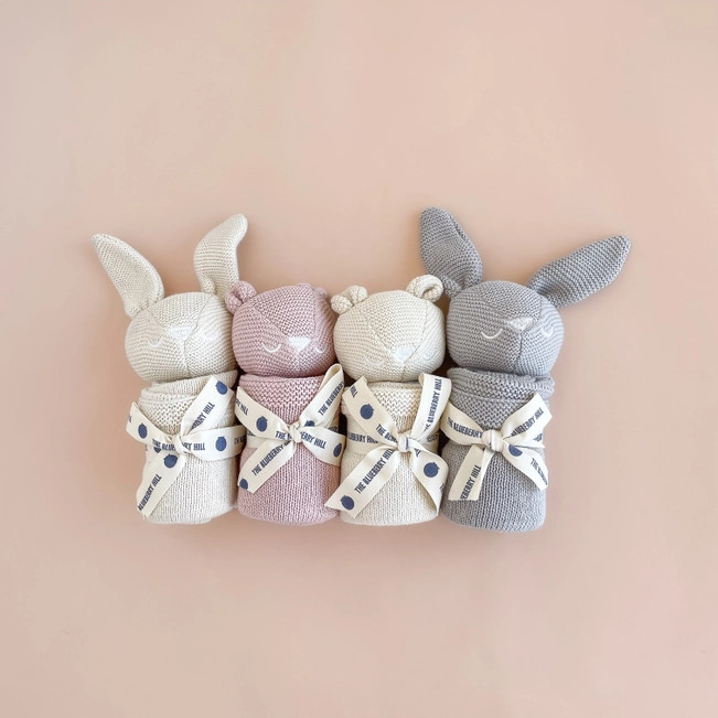 This bunny security blanket from The Blueberry Hill is more than just a toy; it's a source of solace and reassurance. Its small size makes it easy for little hands to grip and hold, making it an ideal companion for naps, bedtime, or anytime your baby needs a little extra comfort. This lovey bunny is a cherished gift that will bring joy and security to your child's world.