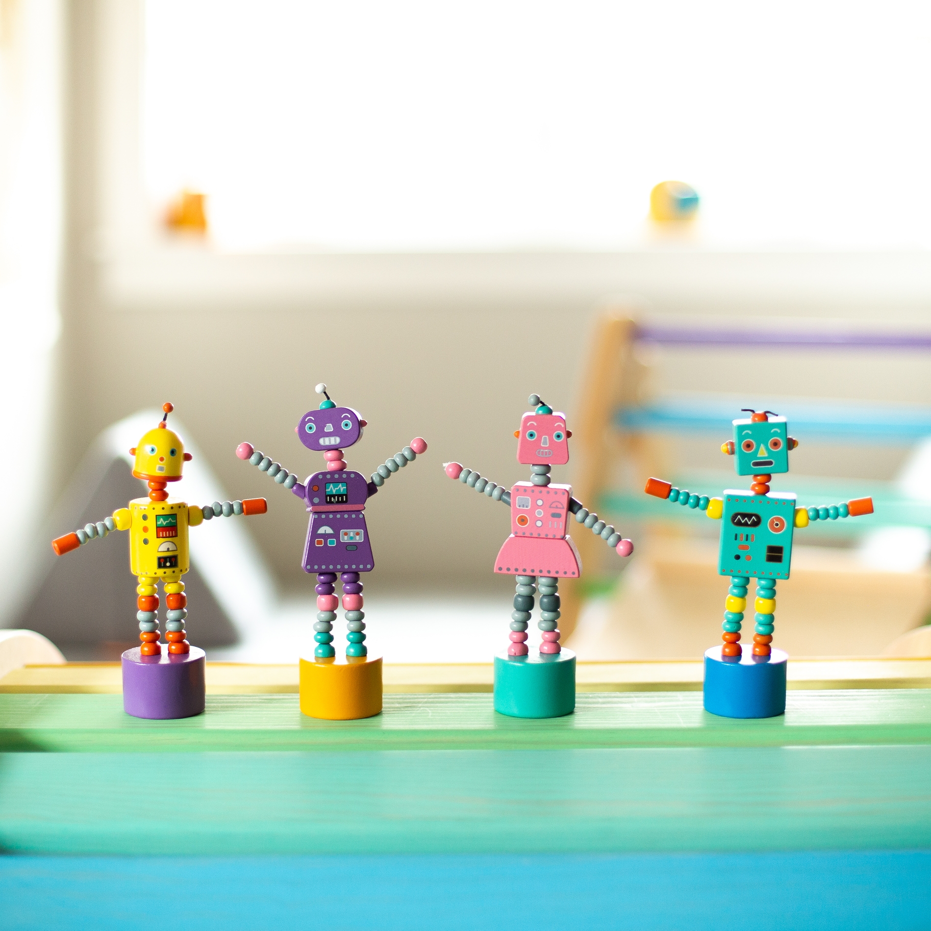 Crafted with quality materials and vibrant colors, these robot push puppet toys are built to last. Each puppet features a unique design, making them a wonderful addition to any collection. Perfect for party favors, stocking stuffers, or a special treat, these Retro Robot Push Puppets from Jack Rabbit Creations offer classic fun with a modern twist.