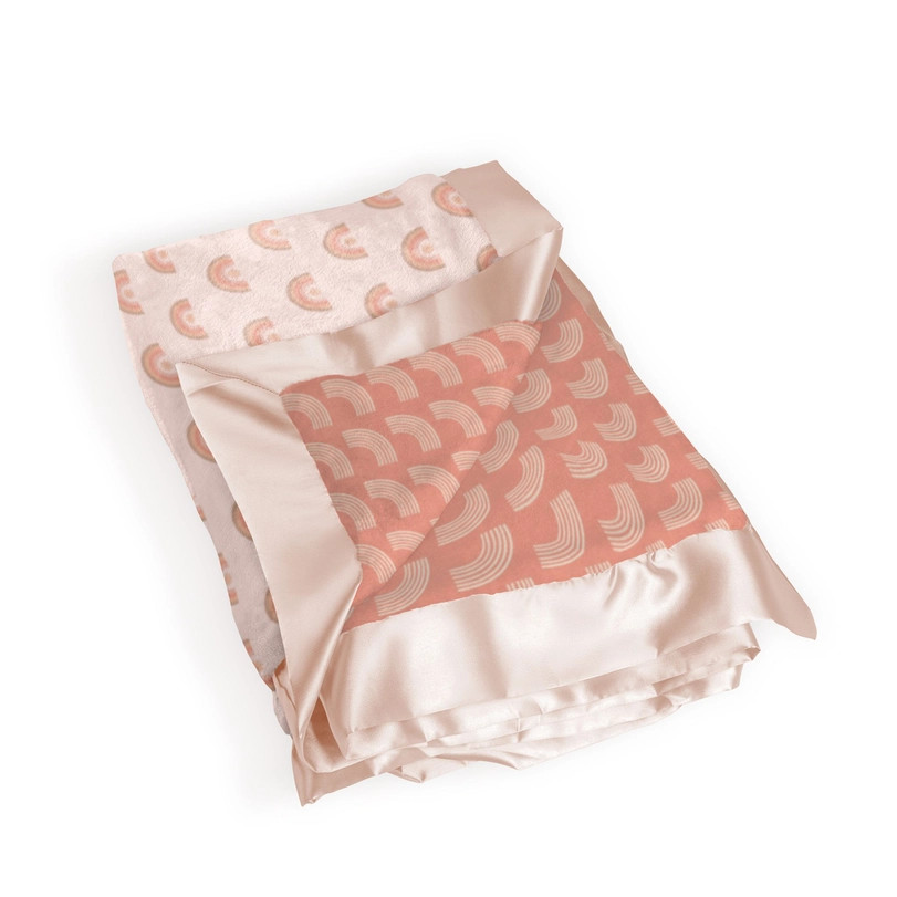 With ultra-soft, thick fabric and a silky satin trim, the double-layered Reversible Baby Rainbow Blanket from JuJuBe × Studio Oh! is a plush addition to any nursery. Each side displays a soothing, pastel color palette with adorable coordinating patterns, such as sweet cherries and dots and cowboy boots and lucky horseshoes.