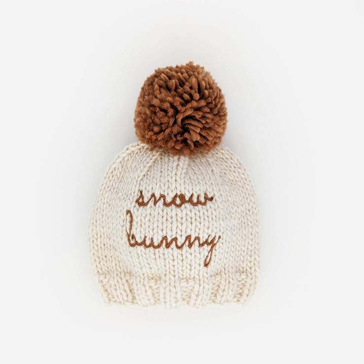 - "Snow bunny" embroidered in rich pecan brown