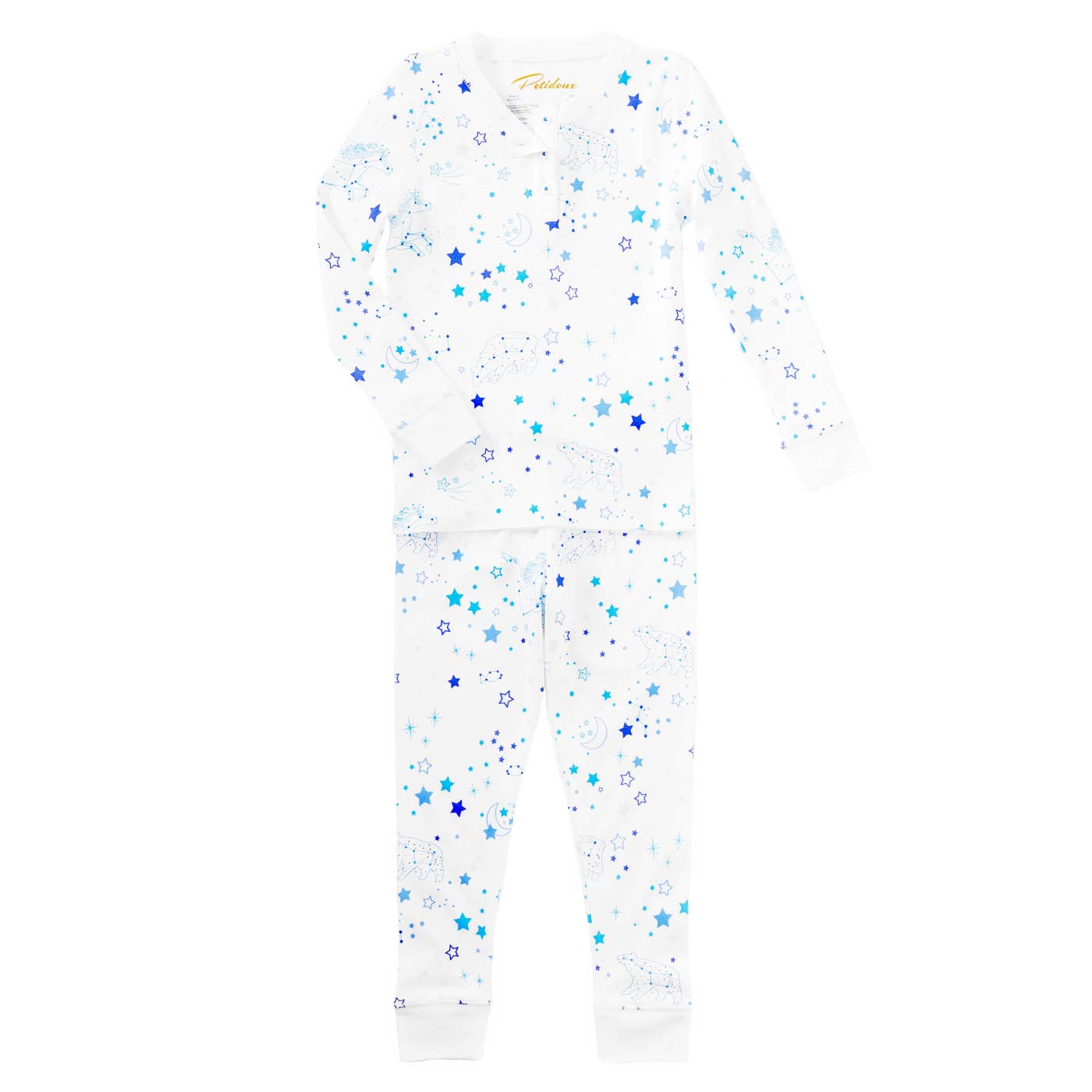 Twinkle Twinkle Little Star...this sweet print allows your little one to shine bright amidst the night sky and constellations... Original print, hand drawn design inspired by the summer nights. This Petidoux print is also available in a baby onesie with matching blanket & knotted hat. 100% Pima cotton, snug fitted children pajamas.mFair Trade, WRAP certified (our manufacturers have been certified to provide fair wages and safe working conditions).