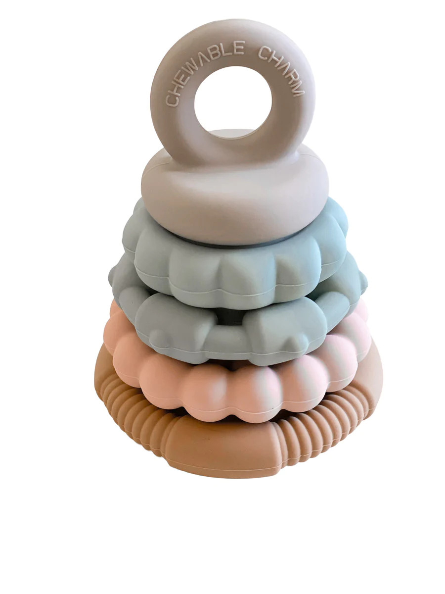 The Sydney Teething Chewable Charm Stacker is the ultimate multi-purpose toy. Teething + Play! Your baby will quickly discover how the stacking rings make the best soothing teethers! Babies will love chewing on the silicone rings and grow into using their hand-eye coordination by stacking the rings. Don't forget to try different stacking designs!