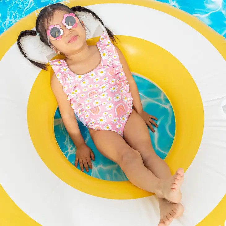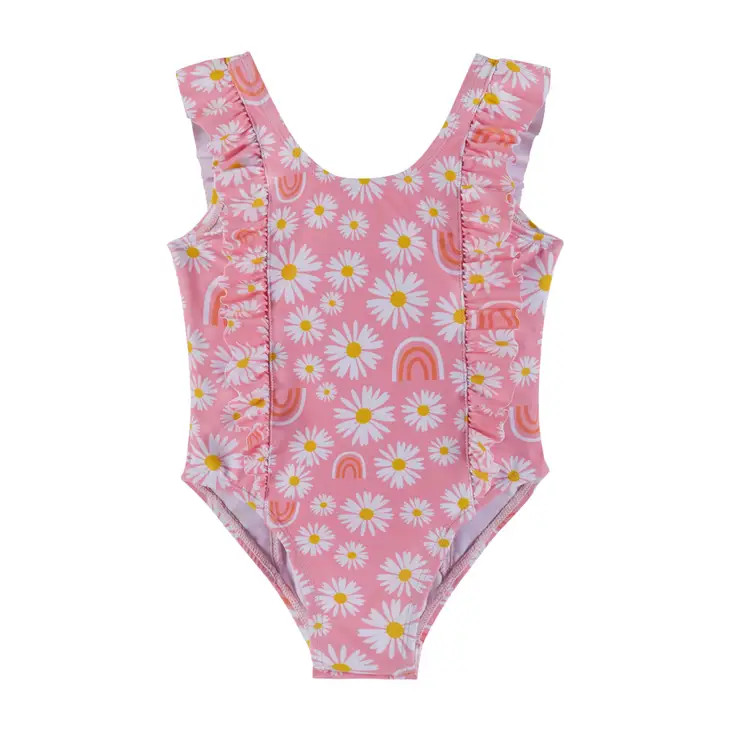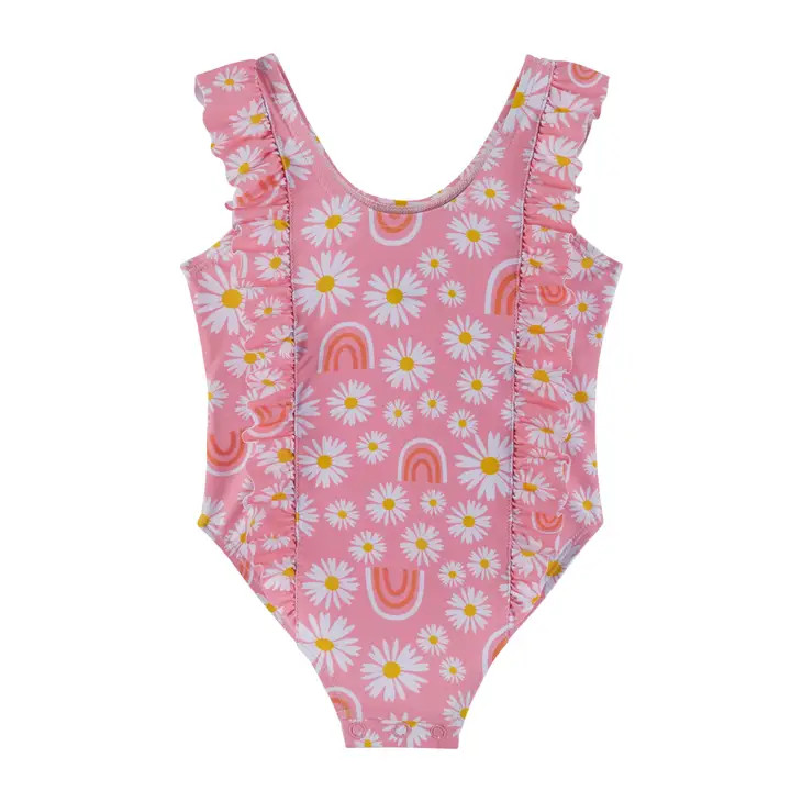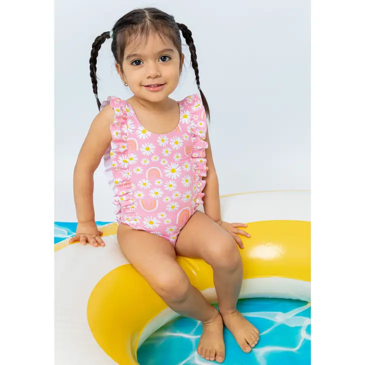 Temperature is rising? Water adventures on the menu? Get ready with this super cool Girl's Pink Daisy & Rainbows Ruffle One-Piece Swimsuit. Our swimwear is designed to keep your kiddos comfortable all day long. Pair this girls one piece daisy swimsuit with one of our reversible hats or cover ups.